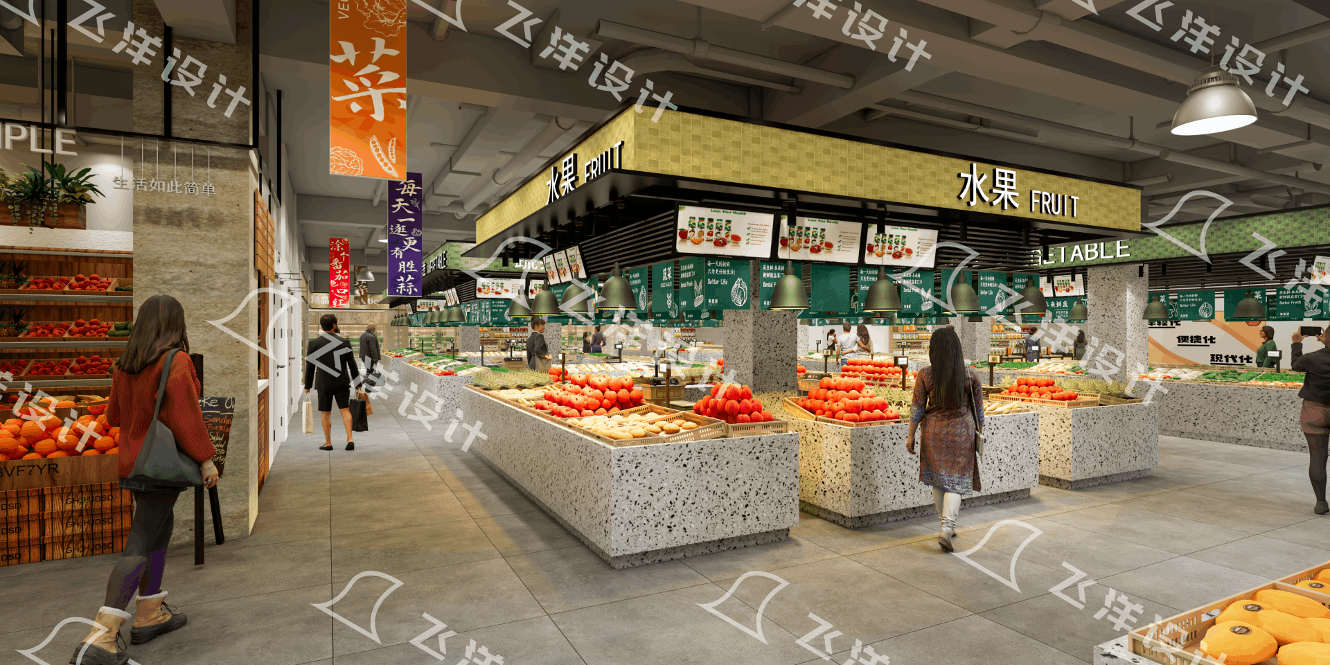 照明設計:基礎照明采用4000KLED平板燈,重點區域(如精品蔬菜、肉類)可增加3000K暖光射燈,提升商品色澤。