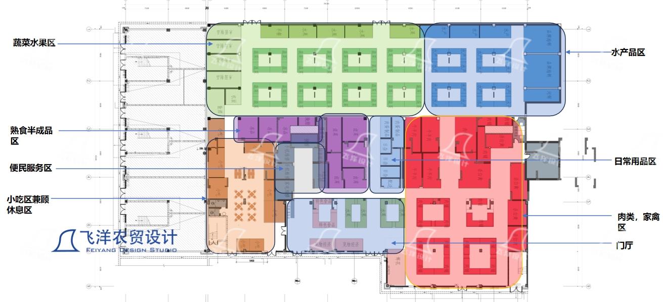 定位確定后,進入平面規劃階段。這一步的核心是動線——顧客怎么走,商戶怎么進貨,攤位怎么擺?