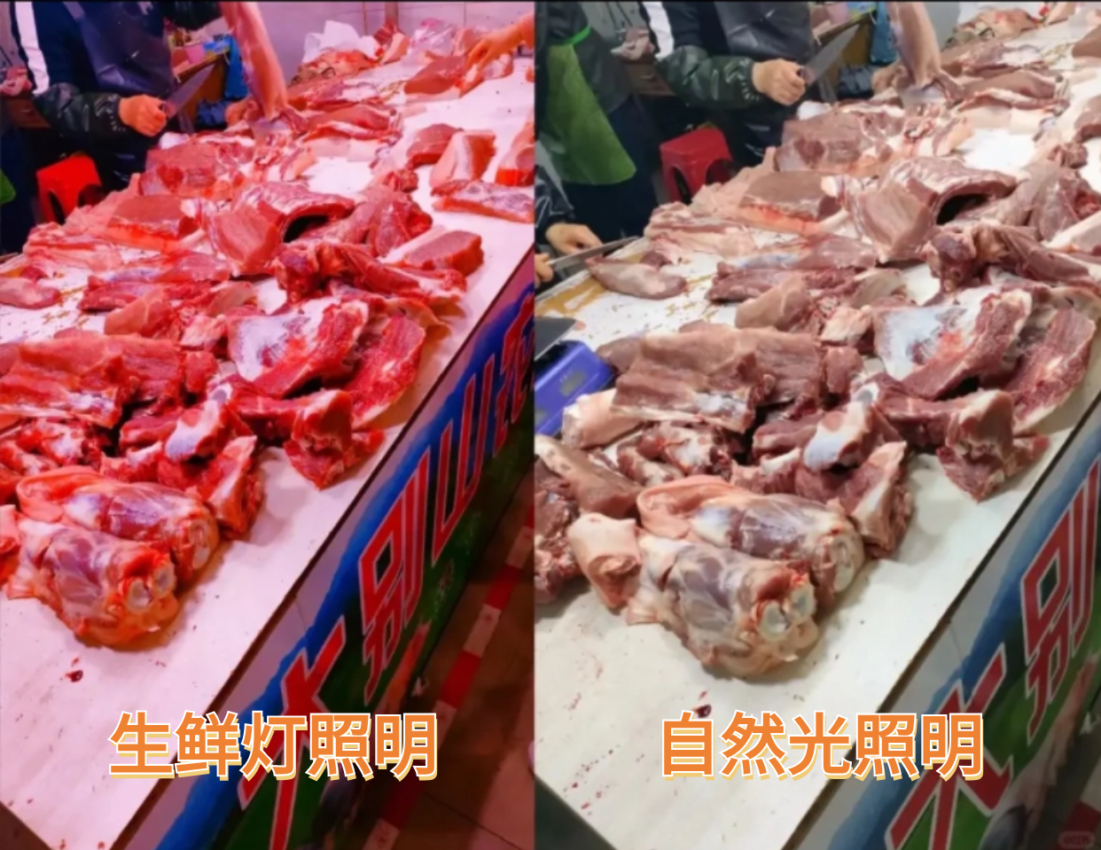 多地市場監督管理局工作人員表示,目前市場監管部門對“生鮮燈”的色標特征、色溫值、顯色系數等要素并未做具體要求,在執法和檢測過程中并沒有嚴謹明確的統一標準,暫時以肉眼辨別為主。