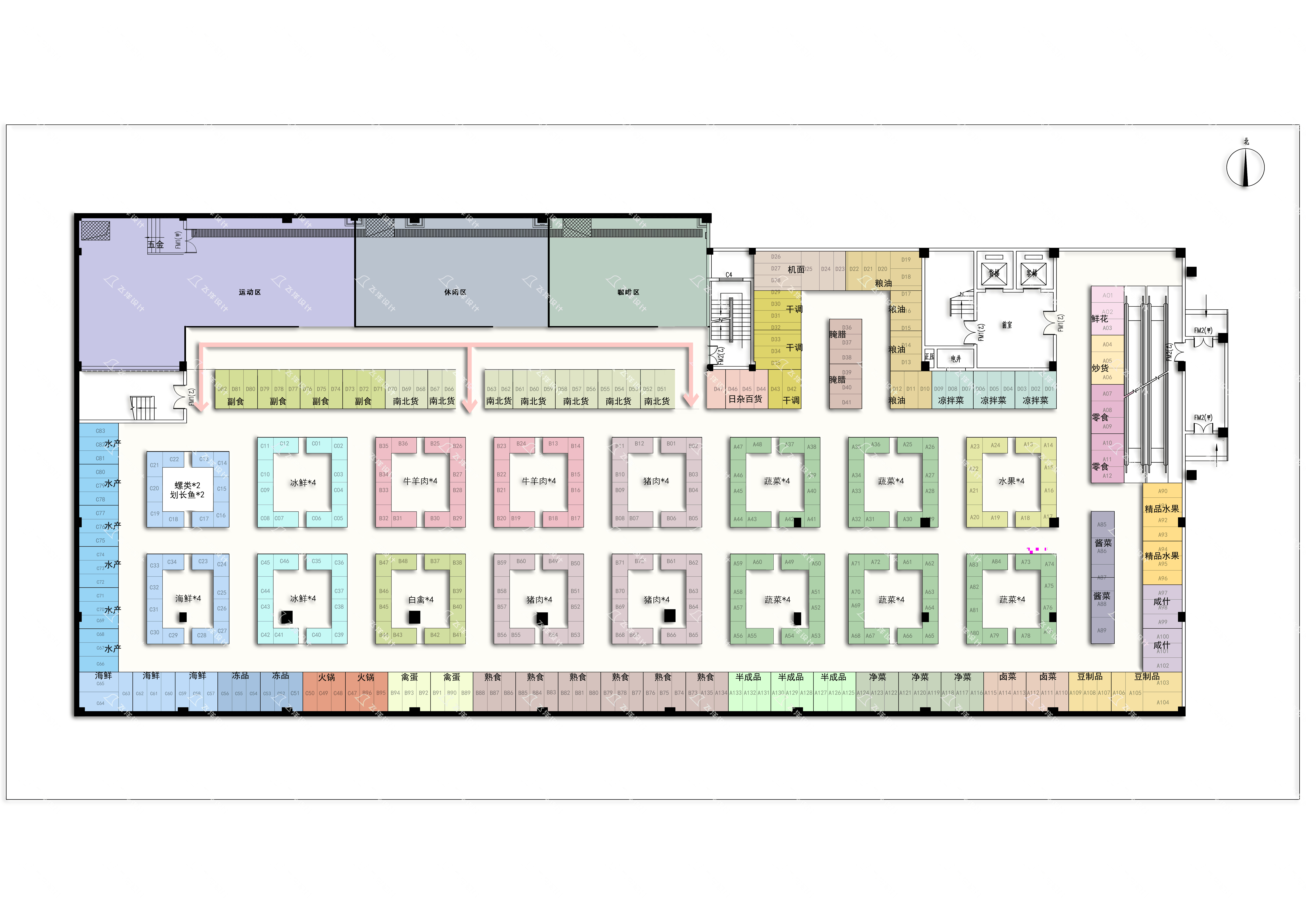 采用色彩編碼系統,清晰劃分果蔬、水產、肉類等不同業態區域