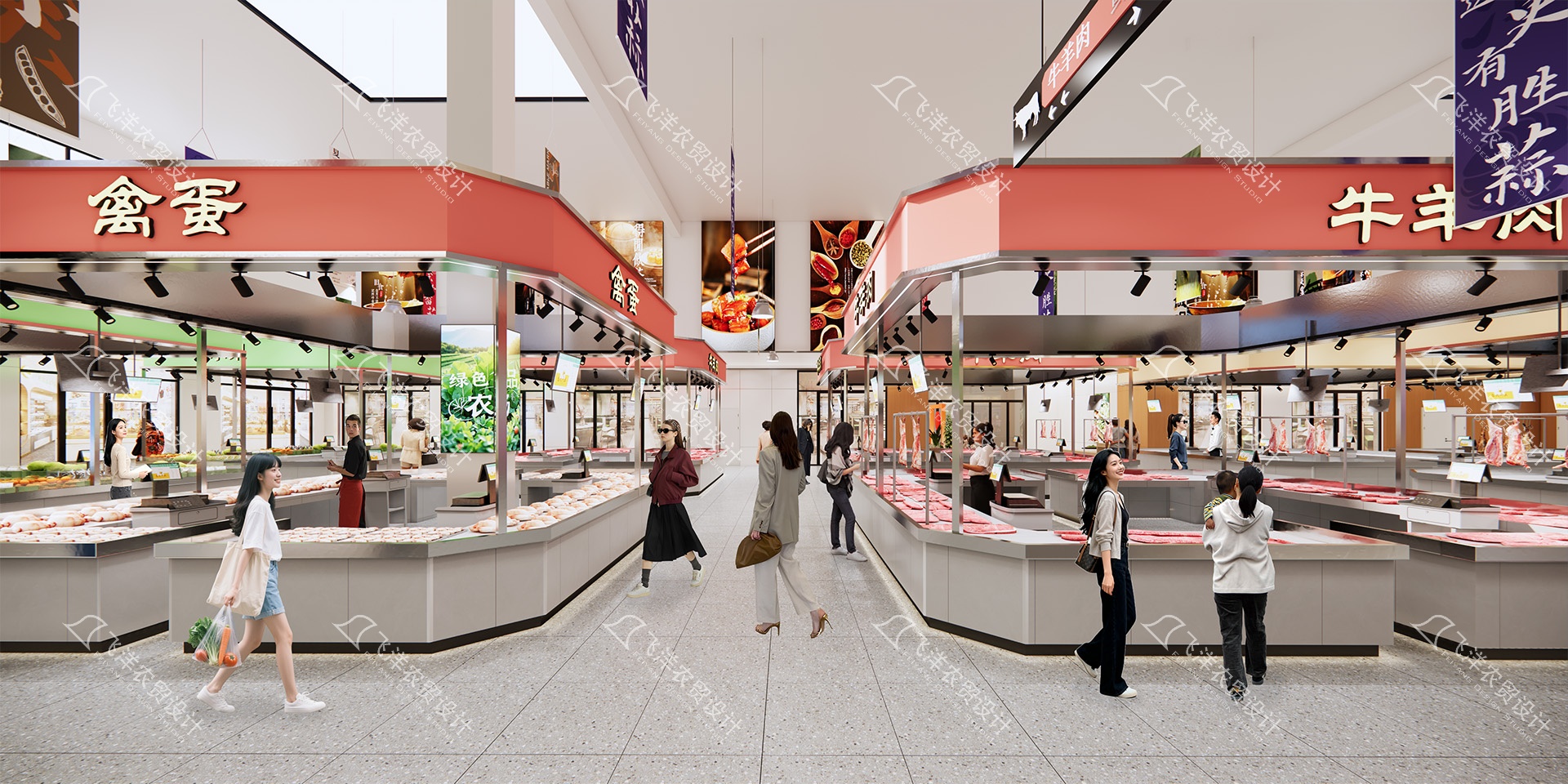 核心層(農貿):嚴格遵循“劃行歸市”,以鮮明的色彩標識系統(果蔬綠、肉類橙、水產藍)集中布局生鮮業態,保障交易效率與基礎客流。
