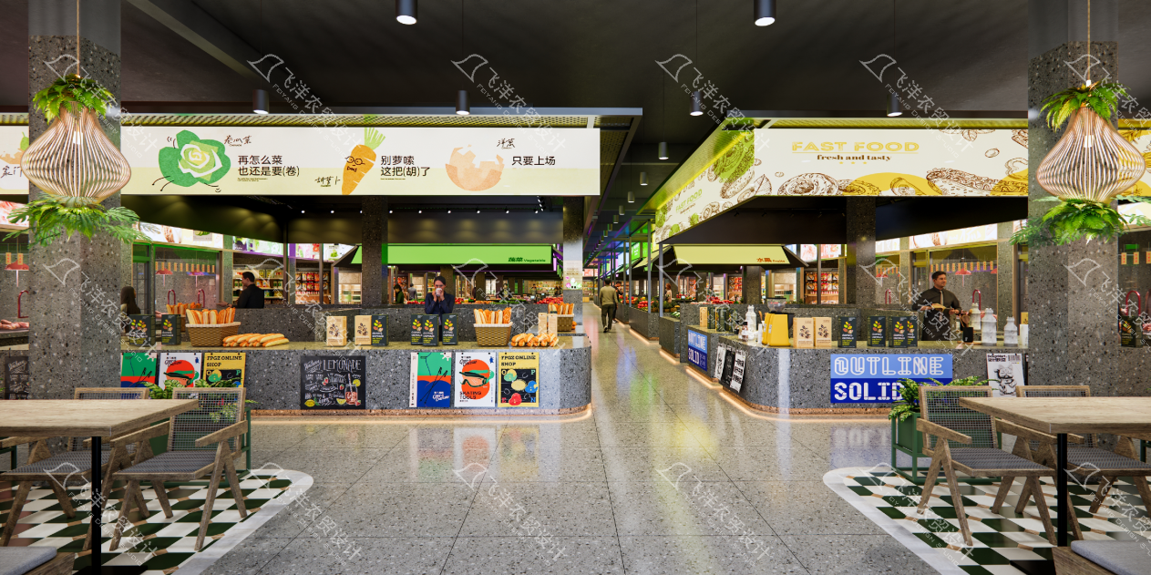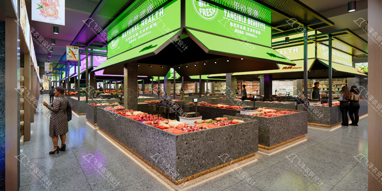 視覺基調:采用淺色系與自然肌理材質,營造明亮、開闊、潔凈的“自然鮮感”氛圍。通過“FRESH”、“HEALTH”等關鍵詞的視覺強化,將食材的健康品質延伸至空間氣質。