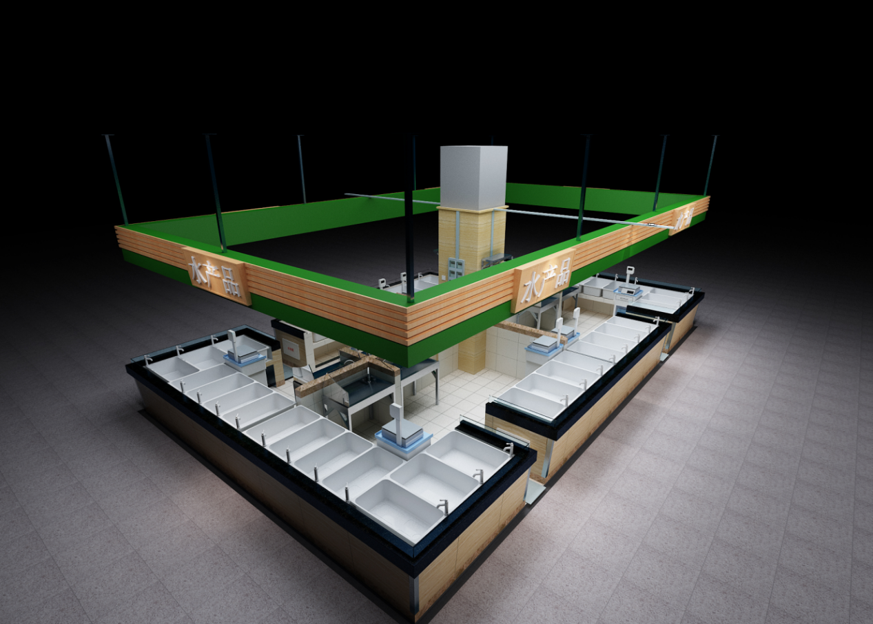 冰鮮水產品交易區柜臺宜設置在靠墻側,布局相對集中。內墻面鋪設瓷磚宜到頂,地面鋪設防滑地磚,應有一定的排水坡度。臺面采用不銹鋼結構或磚砼結構,臺面上加裝多孔不銹鋼板,外貼瓷磚。冰鮮經營攤位還應配置保鮮冷柜。