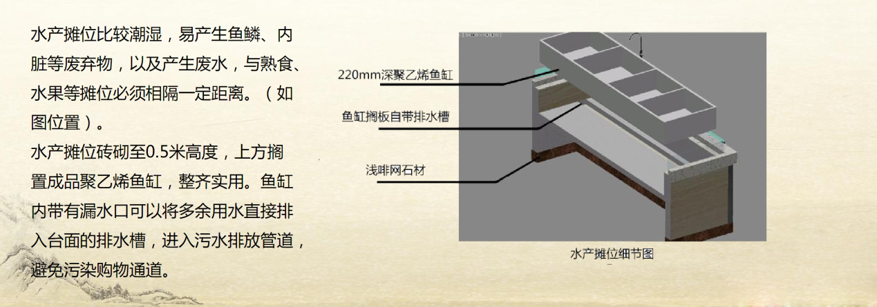 水產(chǎn)攤位比較潮濕,容易產(chǎn)生魚(yú)鱗、內(nèi)臟等廢棄物,以及產(chǎn)生大量臟水,與熟食、水果等攤位必須隔離一段距離。另外來(lái)說(shuō),水產(chǎn)攤位磚必須砌到0.5米高度,上方擱置成品聚乙烯魚(yú)缸,整齊實(shí)用,魚(yú)缸內(nèi)帶有漏水口可以將多余用水直接排入臺(tái)面的排水槽,進(jìn)入污水排放管道,避免污染人流主干道和購(gòu)物環(huán)境。